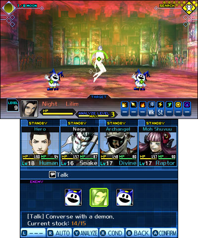 There are moon phases as well to keep note of – eight in total – and while I never found it too important to worry about or even pay attention to, typically on a full moon you’ll have a very low chance of recruiting a demon, with most of them either being too hyper and excited to bother with talking since they’re out for blood, or just simply disgusted with the fact that a human would even think about trying to engage in conversation. Sometimes they’ll get so repulsed they will actually just walk out of the battlefield which will end the fight and not reward you with any experience points or drops. I’ve always found this to be amusing in Shin Megami Tensei titles, especially with so many different dialogue choices and personalities from the plethora of demons in the series that whether you’re successful or not it makes for an entertaining interaction.