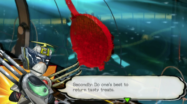 Sometimes the humor comes in the form of absurdity (par for the course as far as Platinum Games is concerned), some of it comes from subtle word usage (e.g. Earth’s defense shield is called “Margarita”, enemies are named “GEATHJERKS” just so characters can call them “jerks” throughout the storyline), and some of it comes from small stylistic motifs, such as the way Wonder Red (effectively the protagonist) refers to people by their full, lengthy titles each time he meets them. This becomes particularly funny sometimes, because none of the other characters point out how silly it is that he does this– they remain stoic through his antics, as though this is normalcy.