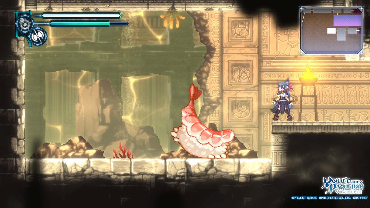 Yohane the Parhelion is a 2D Metroidvania, and if you’ve ever played one in the past you’ll find no surprises here. As Yohane you’ll be traversing a series of interconnected areas, defeating enemies and engaging in some very light platforming, in order to find your missing friends, who are guarded by boss battles that you’ll need to overcome. You’re free to explore as you see fit, but the game will indirectly guide you along the correct path by placing obstacles in your way that will require abilities you’ll acquire later in the game.