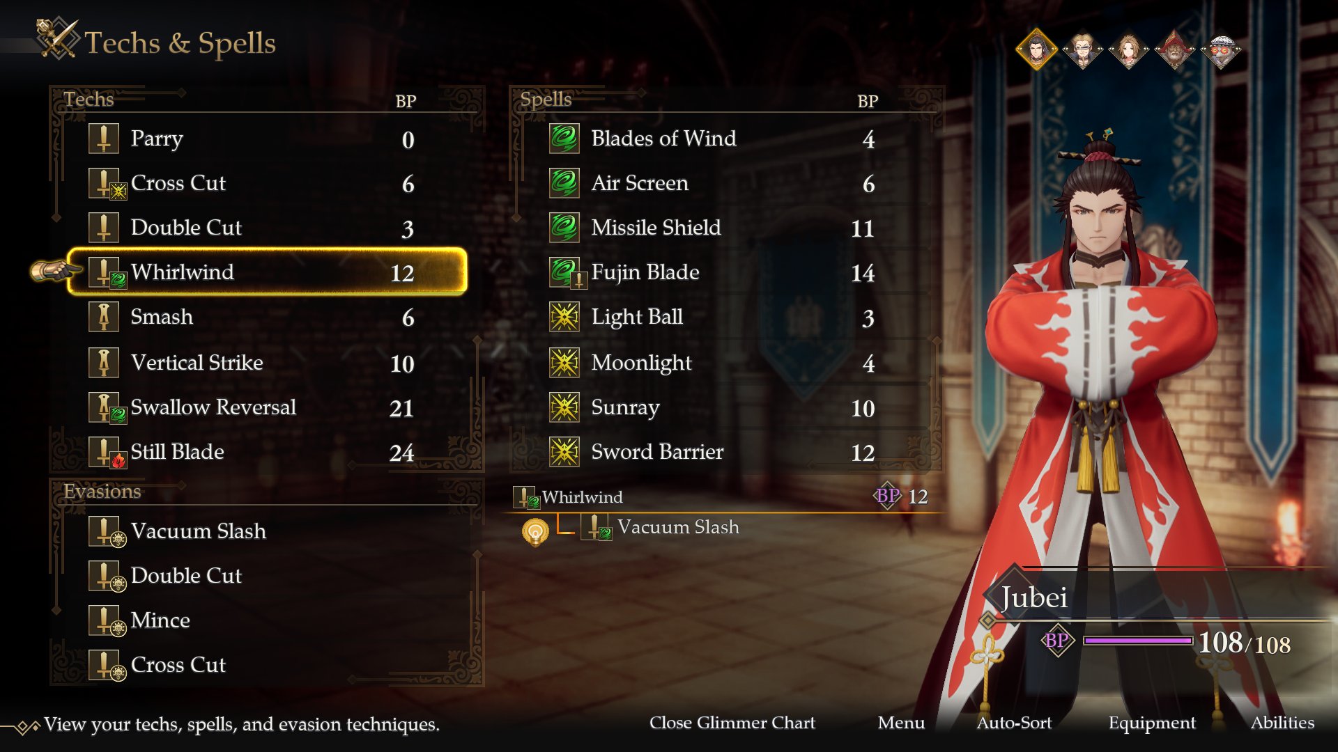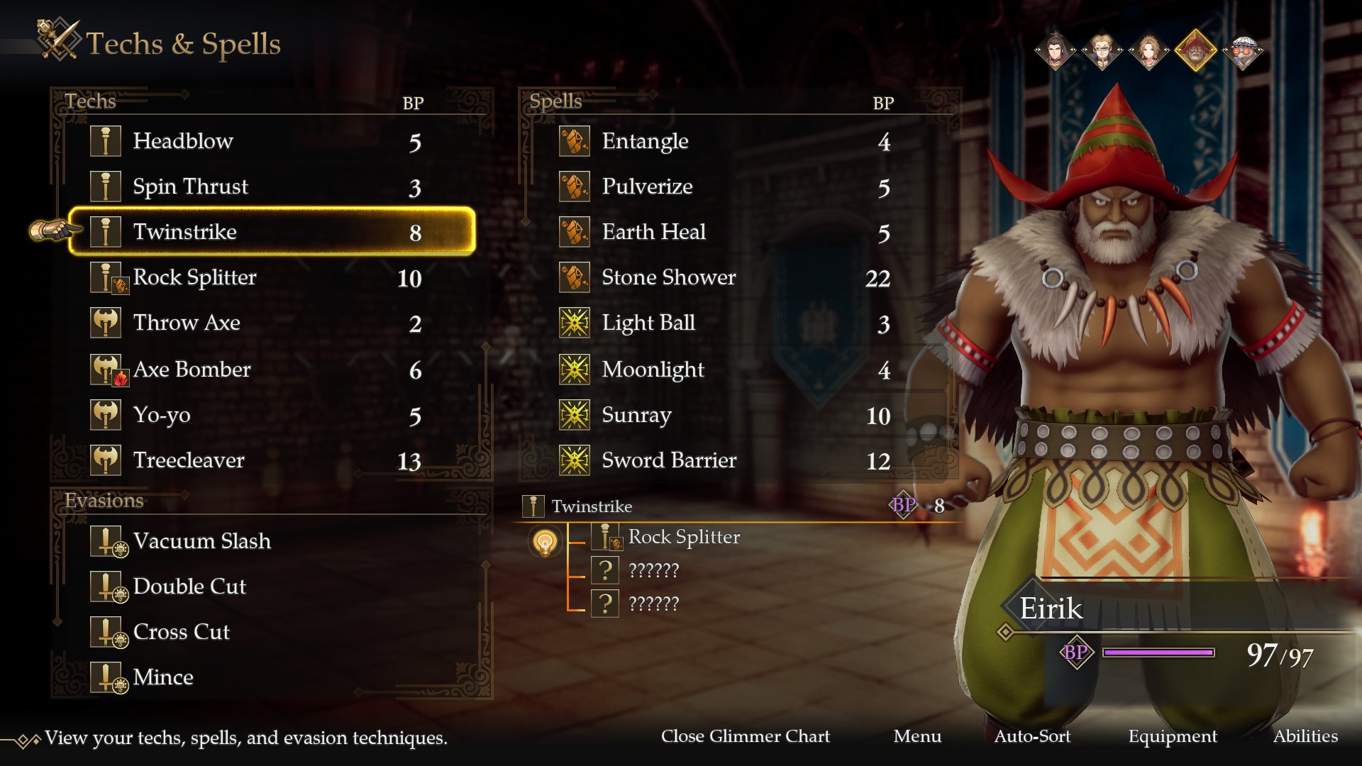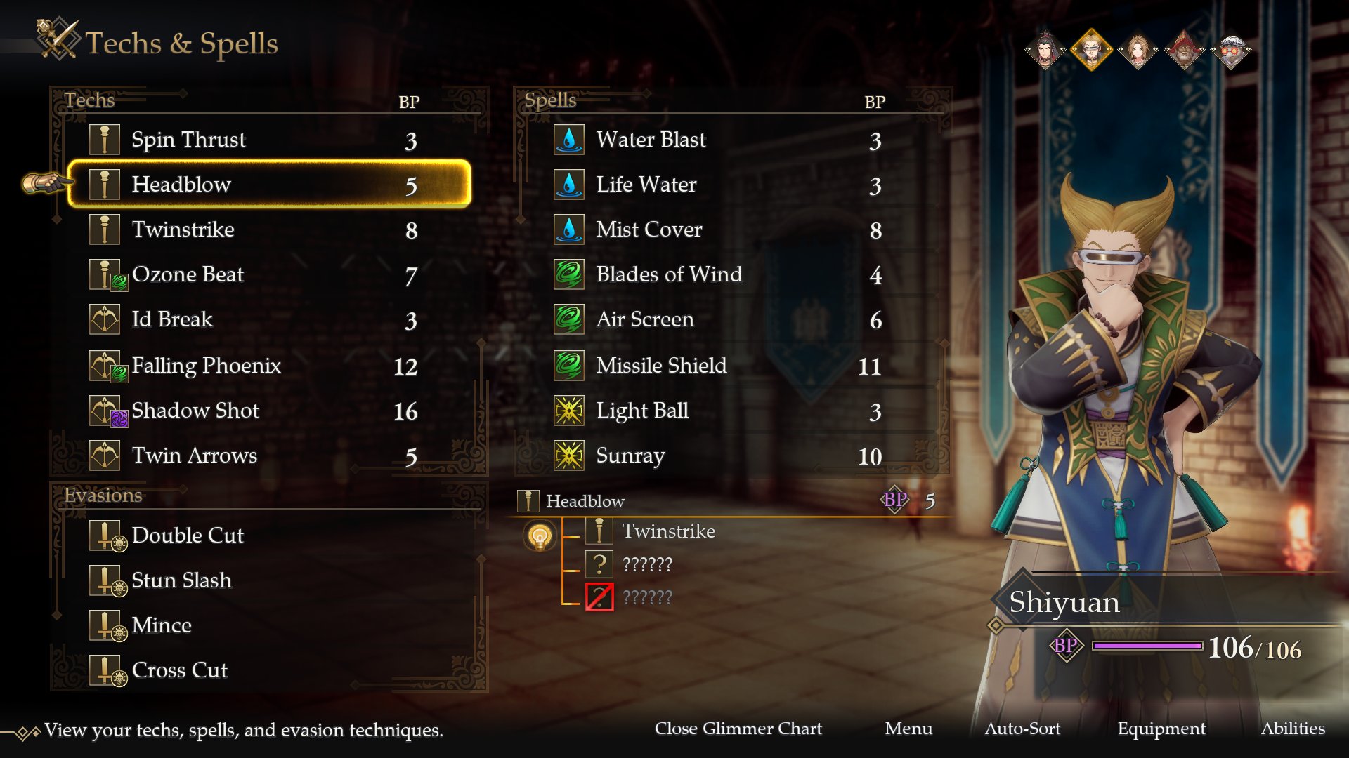 Players can check which character classes can learn what techniques through the glimmer chart. Different character classes have different affinities for learning techniques. Any techniques that have not yet been learned appear as a string of question marks, while any techniques that cannot be learned due to the character class being unable to wield it are marked with an icon struck through with a diagonal line.