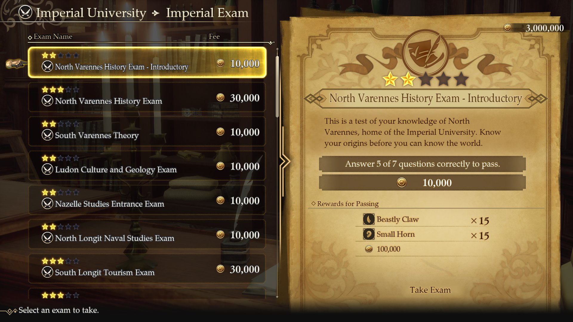 Passing these exams can reward crafting materials and crowns (in-universe currency).
