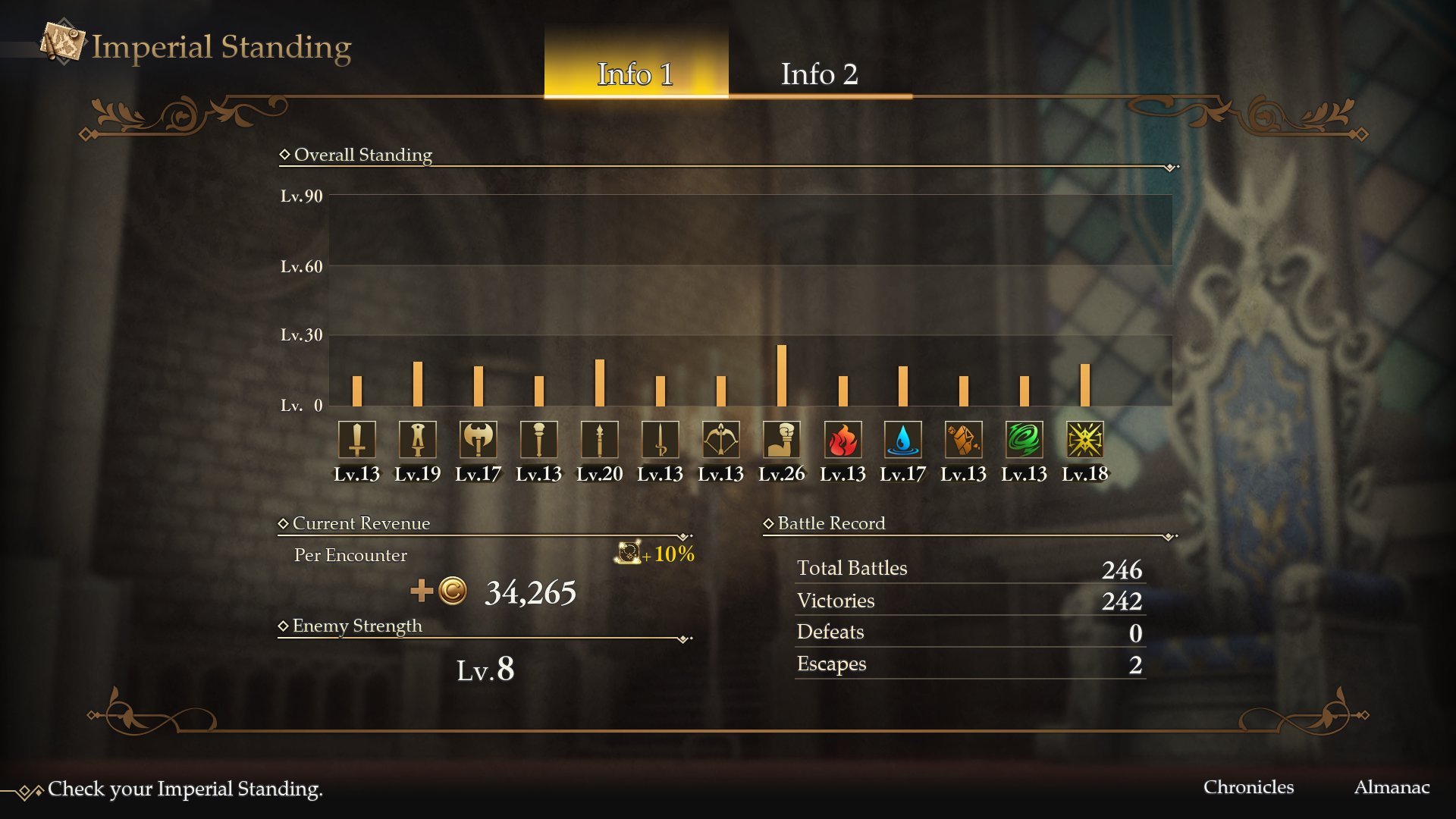This feature allows players to check the Empire’s overall weapon and spell school levels. Overall standing will
