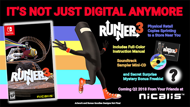 Original (12/23): Runner3 won’t just be an eShop title when it hits Switch in 2018. Choice Provisions is working with Nicalis on a physical version, which will be offered alongside the digital release on day one.