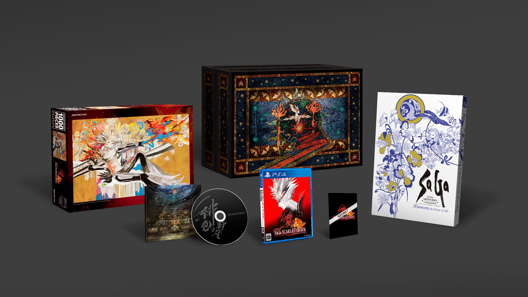 SaGa: Scarlet Grace Special Sound Selection CD – In addition to a careful selection of songs from the in-game background music of SaGa: Scarlet Grace, there are four new songs including “Kudakareshi Hoshi,” as well as the “Hiiro no Jasei” and “Mune ni Kizande” performed SaGa Orchestra Concert 2016. (There are are 15 to 20 songs in total.)