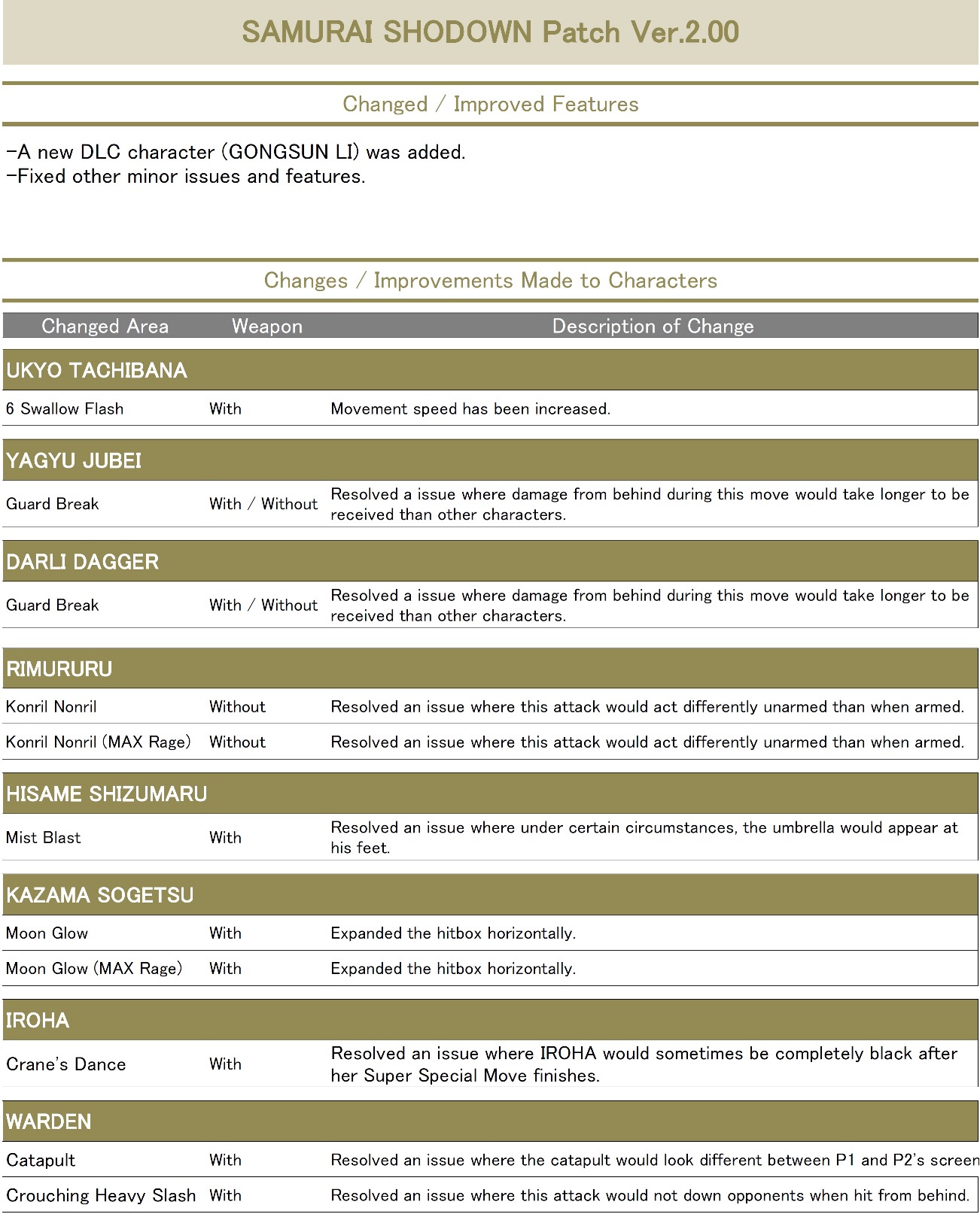 Samurai Shodown received a new update this week, bringing the game to version 2.00. Aside from adding Gongsun Li as a free DLC character and implementing fixes, several character adjustments were implemented.