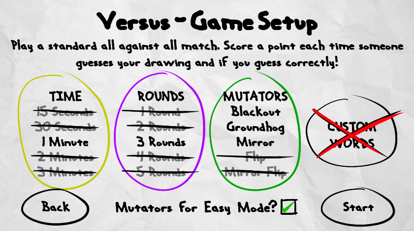With 5 game modes, each offering a different experience, I’ve also included a “Just Doodle” mode, which strips out the timer and the Mutators, giving players a mode where they can just sit back and practice their drawing, make their own rules, or even combine it with Board-games such as Pictionary.