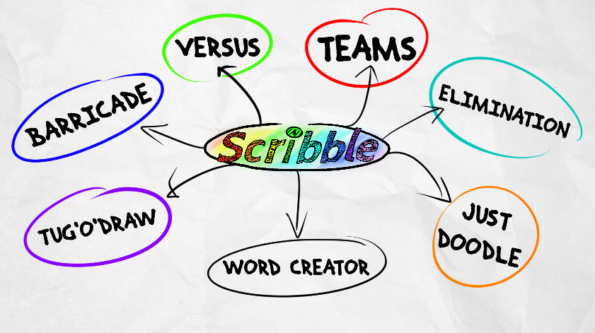 Scribble includes 5 unique modes for up to 8 players: Versus mode (all against all), Teams (Red VS Blue, team sizes 2-6), Elimination (Players take turns drawing until someone fails to guess their picture, at which point they are eliminated from the game (but can still guess other pictures)), Barricade (Blockbusters inspired mode, in which teams try to reach the opposite side of a board from their starting point) and Tug’O’Draw (A team game, but everyone guesses. Whichever team guesses scores the point, and the other team loses one. First to reach 10 points, wins.)