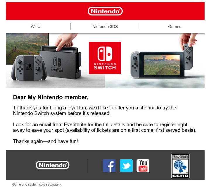 Nintendo has started to send out emails to select My Nintendo members in the United States about an opportunity to try out Switch prior to launch.