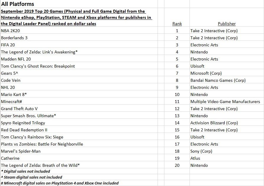 NPD Group has released a listing of the top twenty best-selling games in the U.S. for the month of September 2019. The results can be found below, which includes Zelda: Link’s Awakening in the top five.