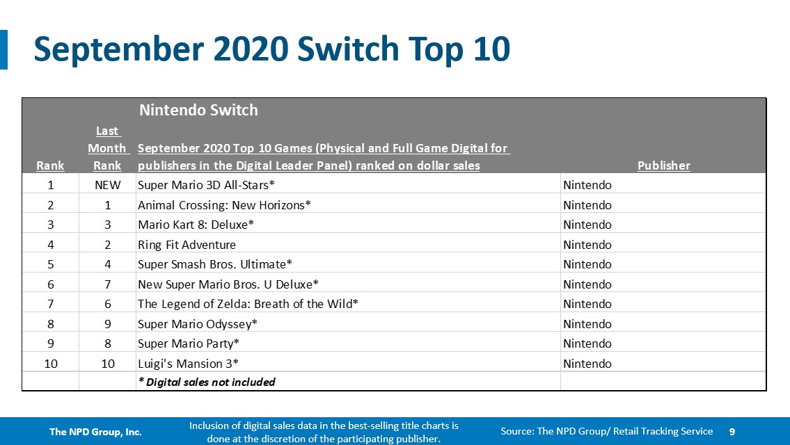 Another round of data is in from this month’s NPD report. Along with the best-sellers on Switch specifically for the month of September 2020, we also have a list of the games year-to-date and have sold the best over the last 12 months. Continue on below for the full results.
