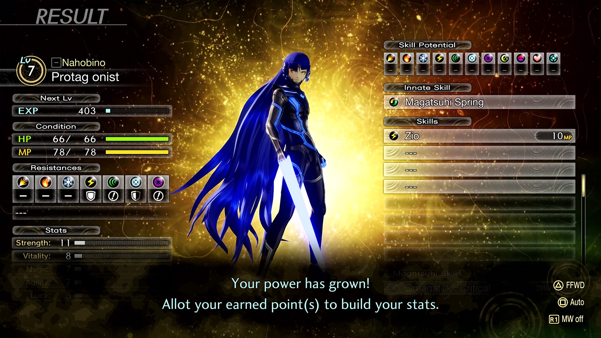 - Protagonist/Nahobino (VA: Casey Mongillo): An ordinary high school senior living in Tokyo. He transforms into a Nahobino, a powerful being capable of using supernatural powers to fight demons. Awaken an epic new form in Canon of Vengeance! The protagonist has completely altered from his characteristic blue appearance. With a sickle-like blade, what is this form capable of?