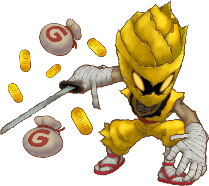 - Metal Ninja: Throws Gitan. Always drops Gitan when defeated, but the amount dropped decreases according to the amount it threw.