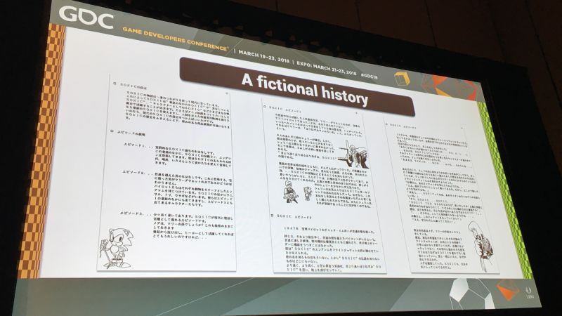 One of the most interesting pieces of information shared during the panel was that the backstory involved a fighter pilot with Sonic painted on the nose of his plane. Yasuhara and Oshima even presented a massive original design document with an extensive story in Japanese.