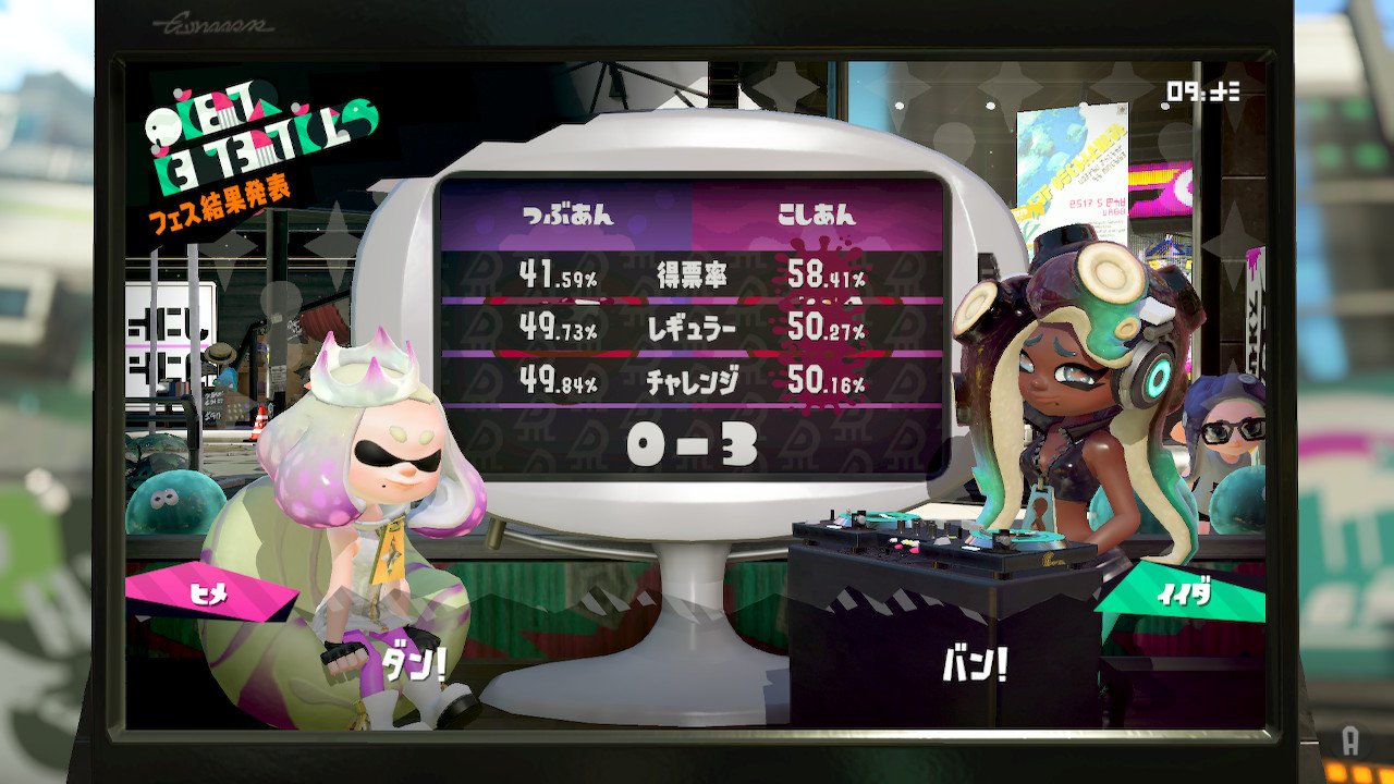 Like the overseas Splatfest, it’s another clean sweep for Marina. Team Koshian took home the win with a 3-0 victory. All categories went to Koshian, including popularity and the battles themselves.