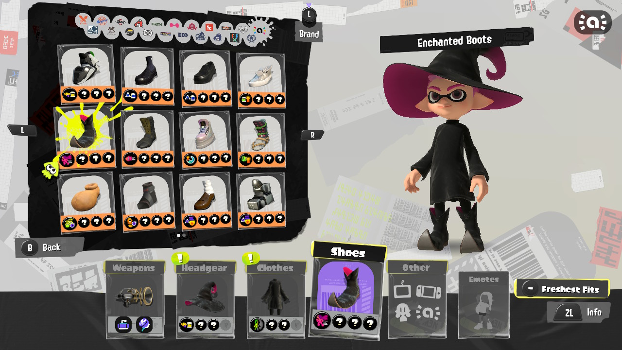 - Octoling Girl (Pink) drops four pieces! It’s the Enchanted set, which makes you look like a witch. This includes a big floppy hat, some pointed boots, and two types of robes.
