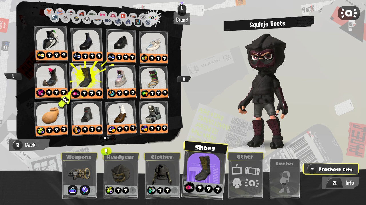 - Inkling Boy (Neon Green) drops four different items, and each one makes you look like a ninja! There are two different hoods, a suit, and a pair of boots.