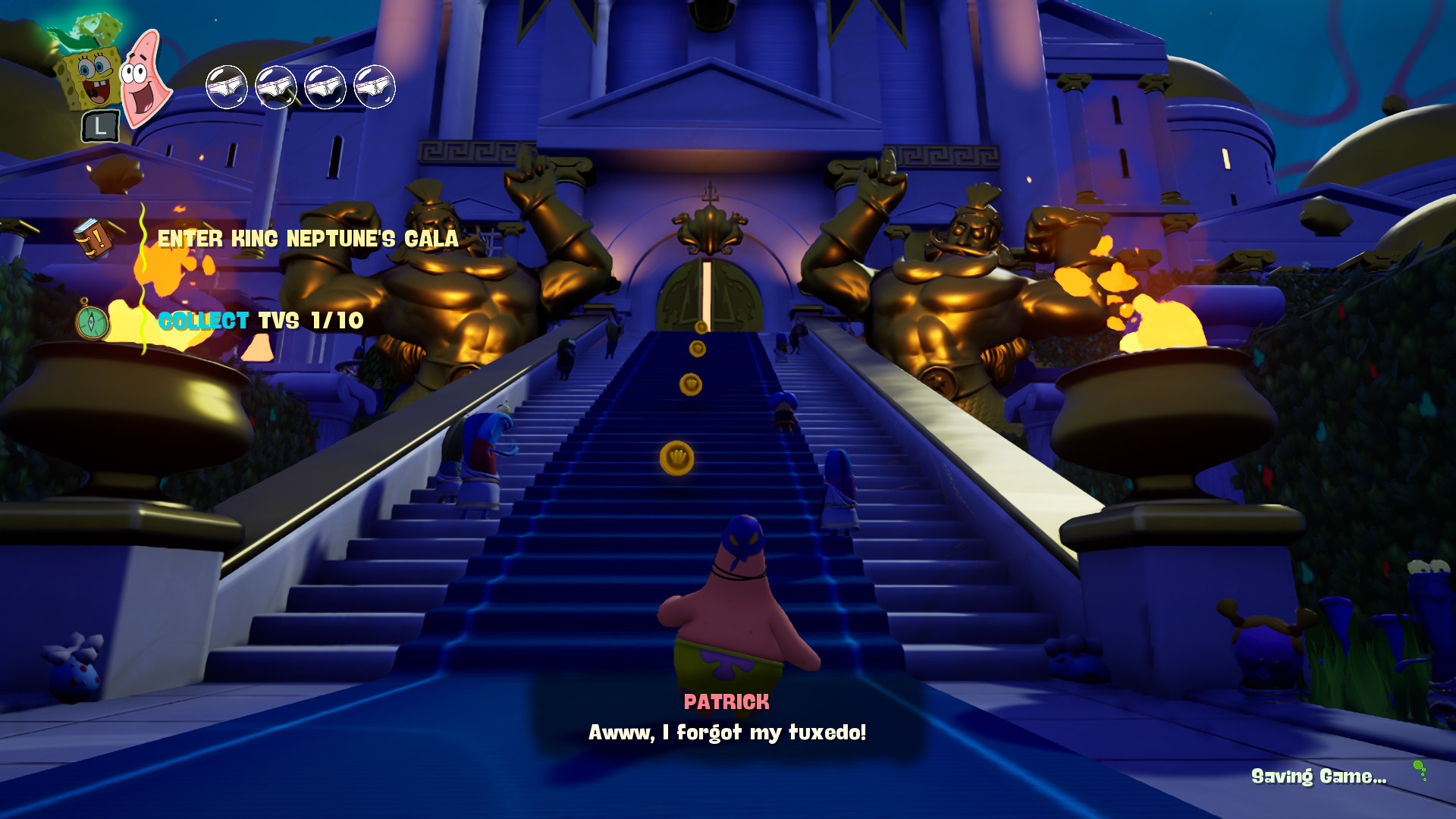 I think this game improves a lot on the flow of the adventure when compared with The Cosmic Shake. There’s no real back-tracking that is mandatory for completion – it is all optional. The gameplay is equally as fun and fluid, with some late-game missions really requiring you to be clever about how you swap out SpongeBob and Patrick to solve puzzles, often in quick succession and it’s a fun reaction-time tester. The stage environments were all quite fun and unique too, going from a ghost-infested jungle within a shoddy holiday island resort to the catacombs beneath King Neptune’s palace, I never really got tired of the visuals and with so many sight gags and collectables to look out for – I was happy to explore levels without feeling like the game was forcing me to. The entire experience is more streamlined, and it feels really good to get from point A to point B whilst messing around a bit in the middle looking for items. There are several minigames spread around the campaign too, including a Krabby Patty cooking challenge, the returning slide-sections from the GameCube era SpongeBob games and some ghost waterboarding segments that feel like something out of Crash 3. It is all very fun, and done sporadically enough to keep the experience fresh without feeling like it is alienating the core platforming.
