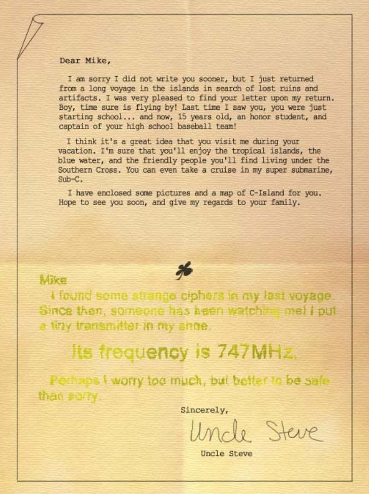 When the game originally launched on the NES, the game’s instruction manual included a physical letter to Mike from Dr. Jones printed on parchment. When players dipped the letter into water, it would provide further instructions for Mike. A code here allows players to progress through the fourth chapter.