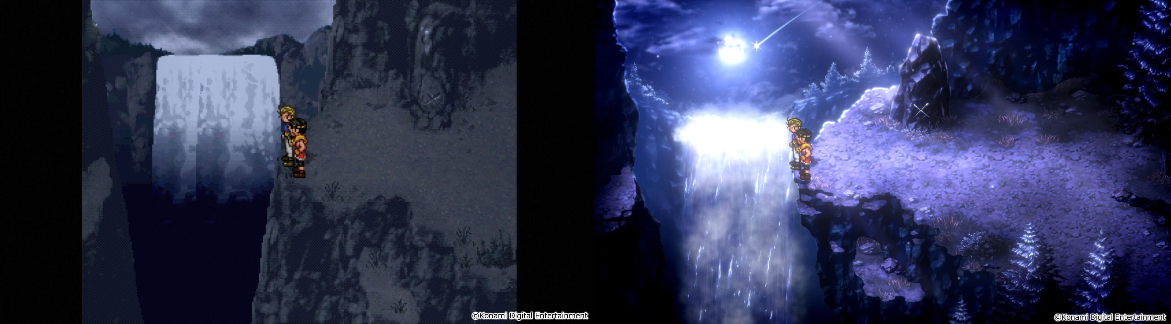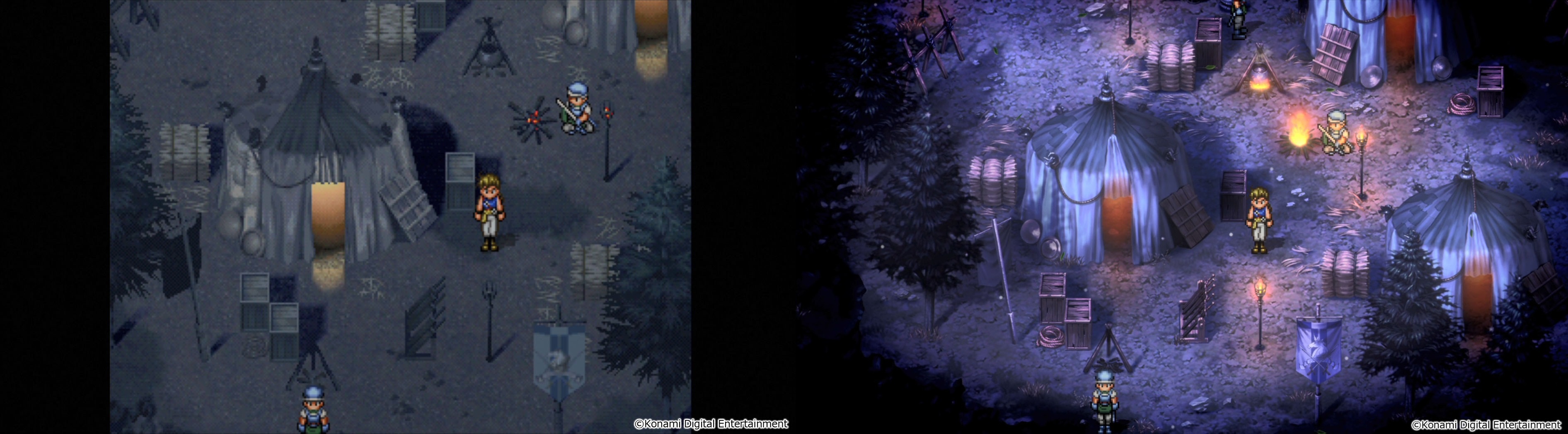 In terms of improvements, Konami previously shared some initial details. We know that the graphics have been spruced up with all background illustrations upgraded to HD and updated effects for the pixel art animation. Konami has also mentioned new environmental sounds effects, battle sound effects that are also now HD, newly added auto-save, the ability to fast forward battles, and the inclusion of a conversation log.