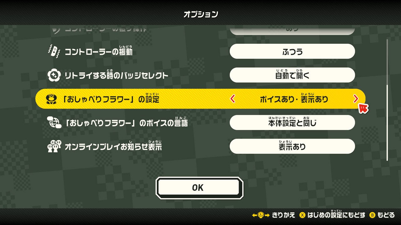 You’ll notice there are a few other options here as well. On the topic of the Talking Flowers, you’ll be able to choose which language the Talking Flowers speak in. Other settings include controller vibration intensity, badge selection on continues, and online play notices.