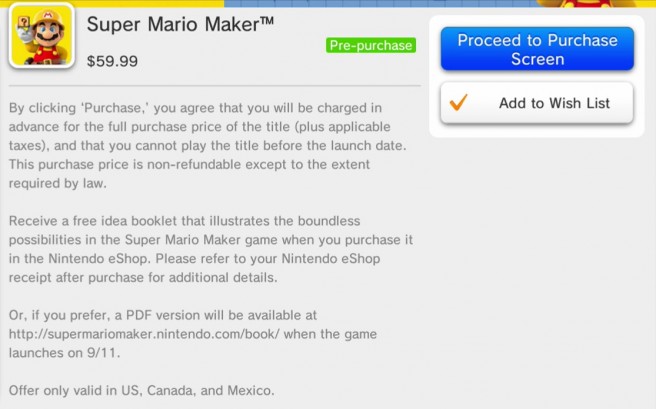 Super Mario Maker can now be pre-loaded on the North American Wii U eShop. By making a purchase, you’ll be able to play the digital version when the game launches on September 11 at 12 PM ET after a small update is applied.