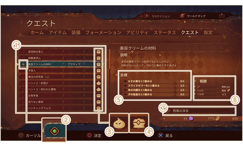 – Game shows you the list of accepted Quests, whether it’s active, the quest type (subjugation and fetch / delivery), reward, and where to go