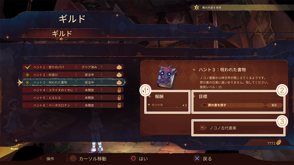– You can see which Quests and Hunt Quests you have accepted in the Quest menu