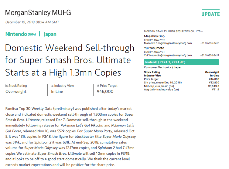 Though data isn’t entirely final, early reports indicate that Super Smash Bros. Ultimate may have sold somewhere around 1.3 million copies in its first week in Japan. The information appears to come from Morgan Stanley based on Famitsu-recorded numbers.