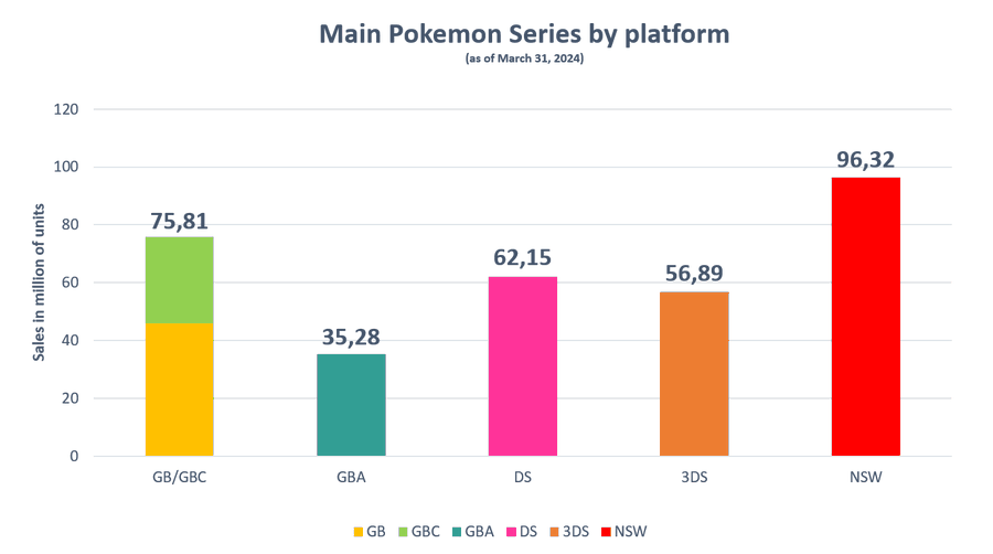 Moving back over to Pokemon’s performance on Nintendo platforms, after Switch, Game Boy / Game Boy Colors follows in second with 75.81 million units. DS, 3DS, and GBA round out the list at 62.15 million, 56.89 million, and 35.28 million respectively.
