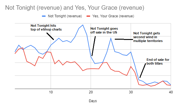 I still just didn’t want to believe that this was the only way to sell on the eShop. So we decided to take Yes, Your Grace, and do a semi-deep discount, push it hard, and track the two sales against each other.