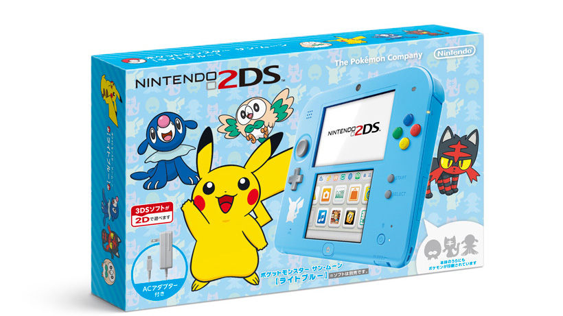 Nintendo and The Pokemon Company are preparing a special 2DS system for Japan. On December 8, a light blue design featuring Pikachu and the Sun/Moon starters will go on sale. Pricing is set at 10,584 yen.