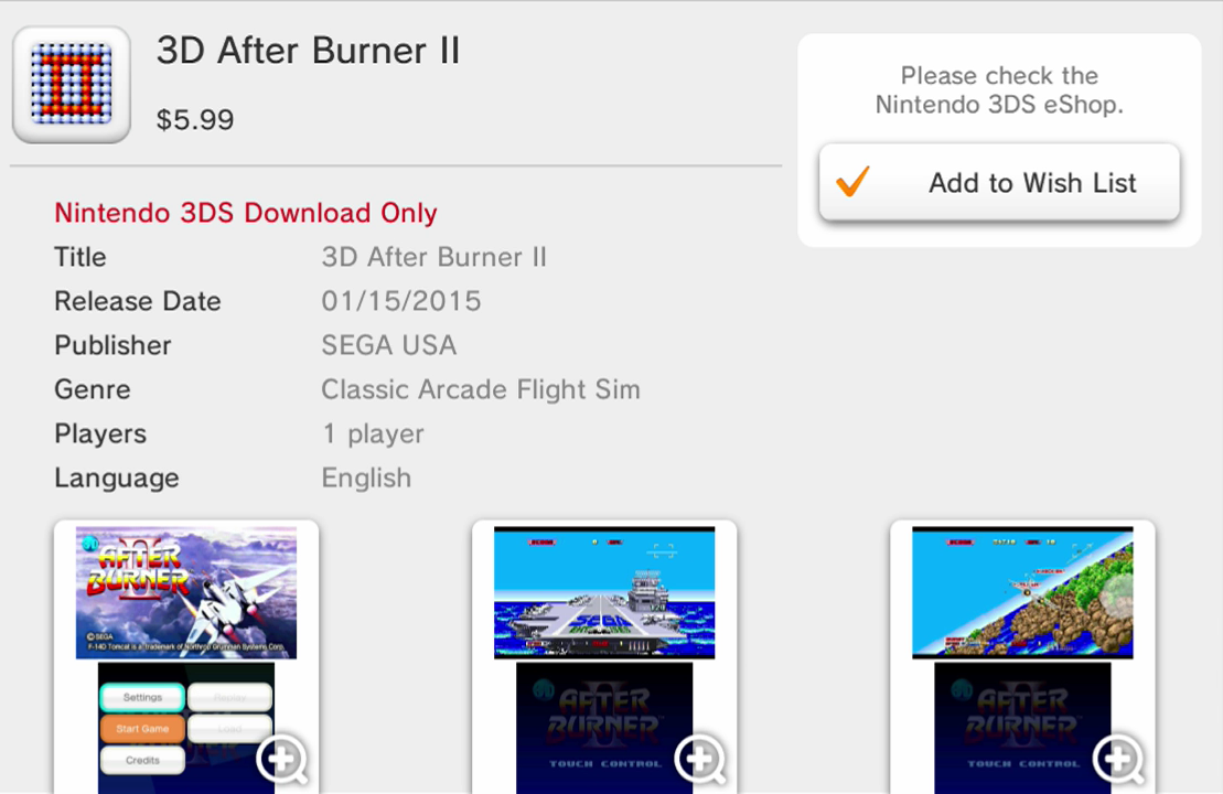 3D After Burner II isn’t just coming to the European 3DS eShop next week. A launch is scheduled for North America as well, based on a listing included in the store. It will be available for $5.99.