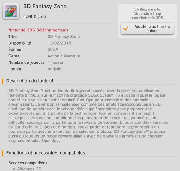 3D Fantasy Zone listed for release in Europe next week