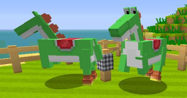 Hooktail (from Paper Mario: The Thousand-Year Door) was as least considered as the Ender Dragon instead of Gobblegut. Also shown is Midbus as the Pigs and Yoshi as the Horses. Lastly, we’re able to see the Ender Chest with a Mr. I-themed design instead of the Shy Guy-themed design it has in the final release.