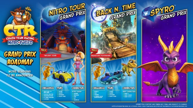 As we just found out a few minutes ago, Activision and Beenox are planning free bonus seasonal content for Crash Team Racing Nitro-Fueled with Grand Prix in-game offerings post launch. As part of this, it’s been confirmed that Spyro will be joining the game. We have a look at the upcoming content roadmap above.