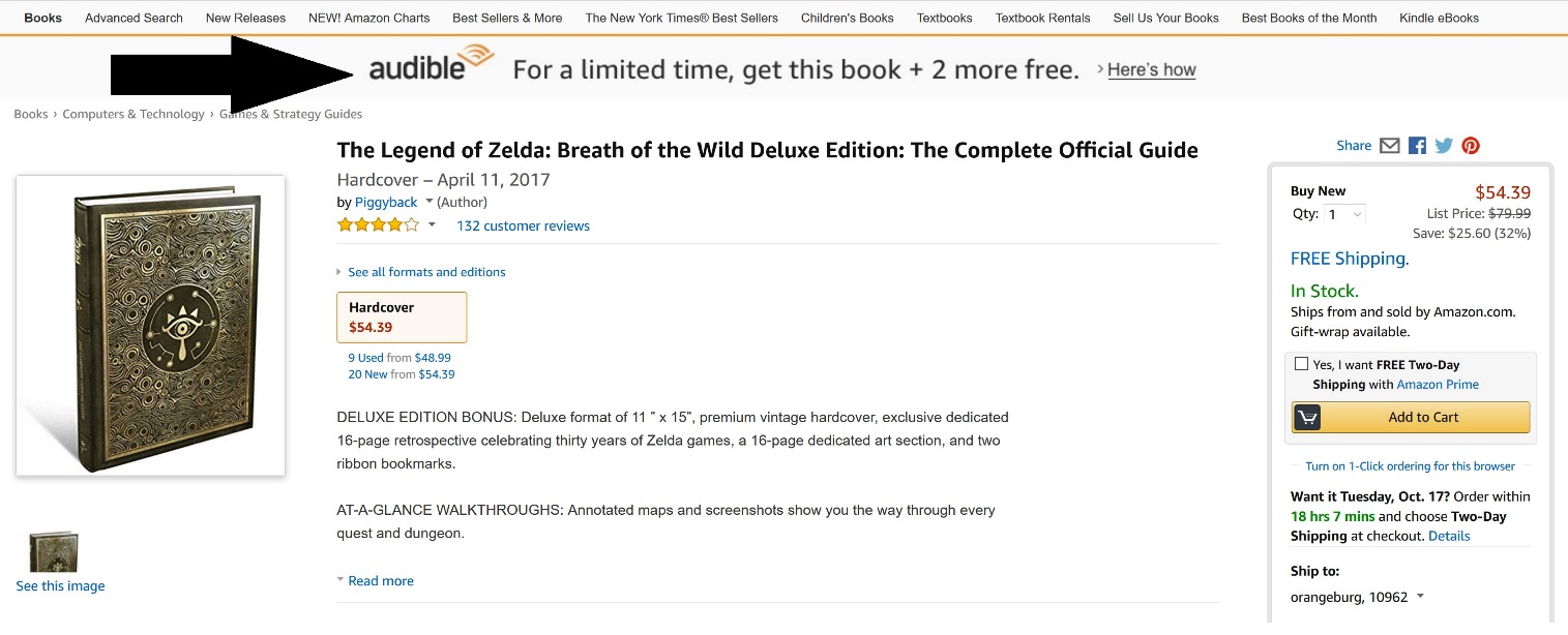 Original (10/14): Amazon is running a new offer on its website that could net you a free copy of the Zelda: Breath of the Wild Deluxe Edition guide. On the listing page, you should see a banner advertising an opportunity to get the book free as well as two others with an Audible trial. Click on that banner (it may require a refresh if you’re not seeing the correct banner) and start the trial (you can cancel pretty much immediately or whenever else you want).