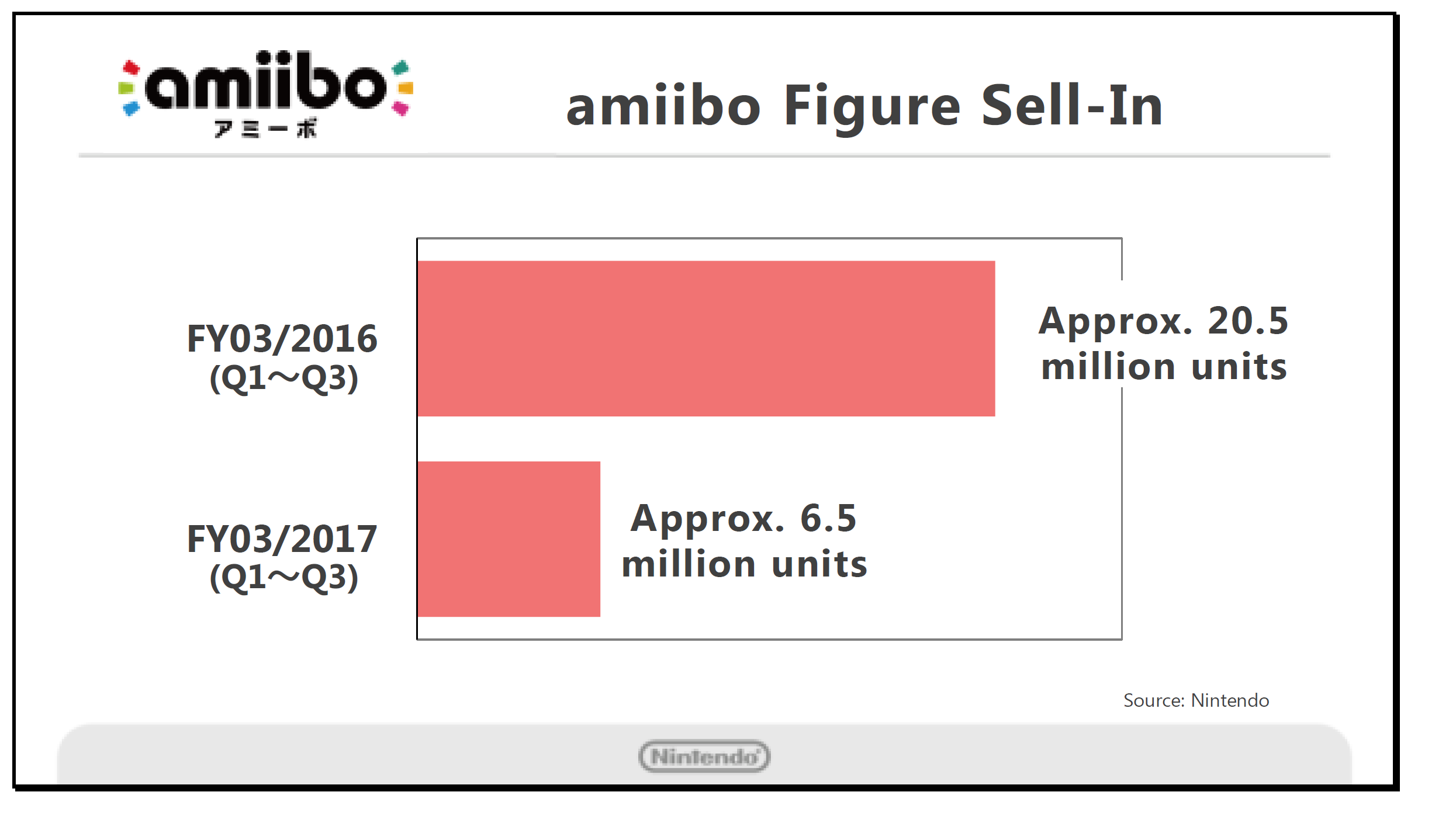 This figure shows the sell-in for amiibo figures compared to the previous period. In the previous period, we sold many amiibo, particularly in the Super Smash Brothers series, reaching total sell-in of approximately 20.5 million units. Sell-in for this period was approximately 6.5 million units.