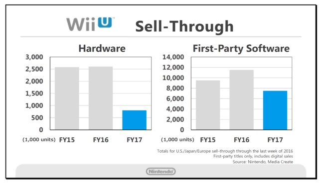 This slide compares sell-through for Wii U hardware and first-party packaged software in Japan, the U.S. and Europe from April 2016 through the last week of the calendar year, compared with the same period over the past two years. We significantly decreased the shipping volume for Wii U this fiscal year compared to the fiscal year ended March 2016 and set our sales expectations at 800,000 units. As a result, hardware sell-through is down significantly compared to the previous two years. Also, there were fewer new titles this year, resulting in reduced trends in software sell-through compared to previous periods, but both the hardware and software results are largely in alignment with our expectations.