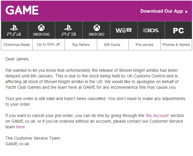 GAME UK sent out the notice above today, claiming that the new release date is January 8. Amazon UK also has it pinned down for the same day. Hopefully this will be Shovel Knight’s final delay in the region!