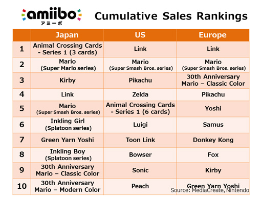 amiibo – cumulative sales rankings, most shipments in the Americas