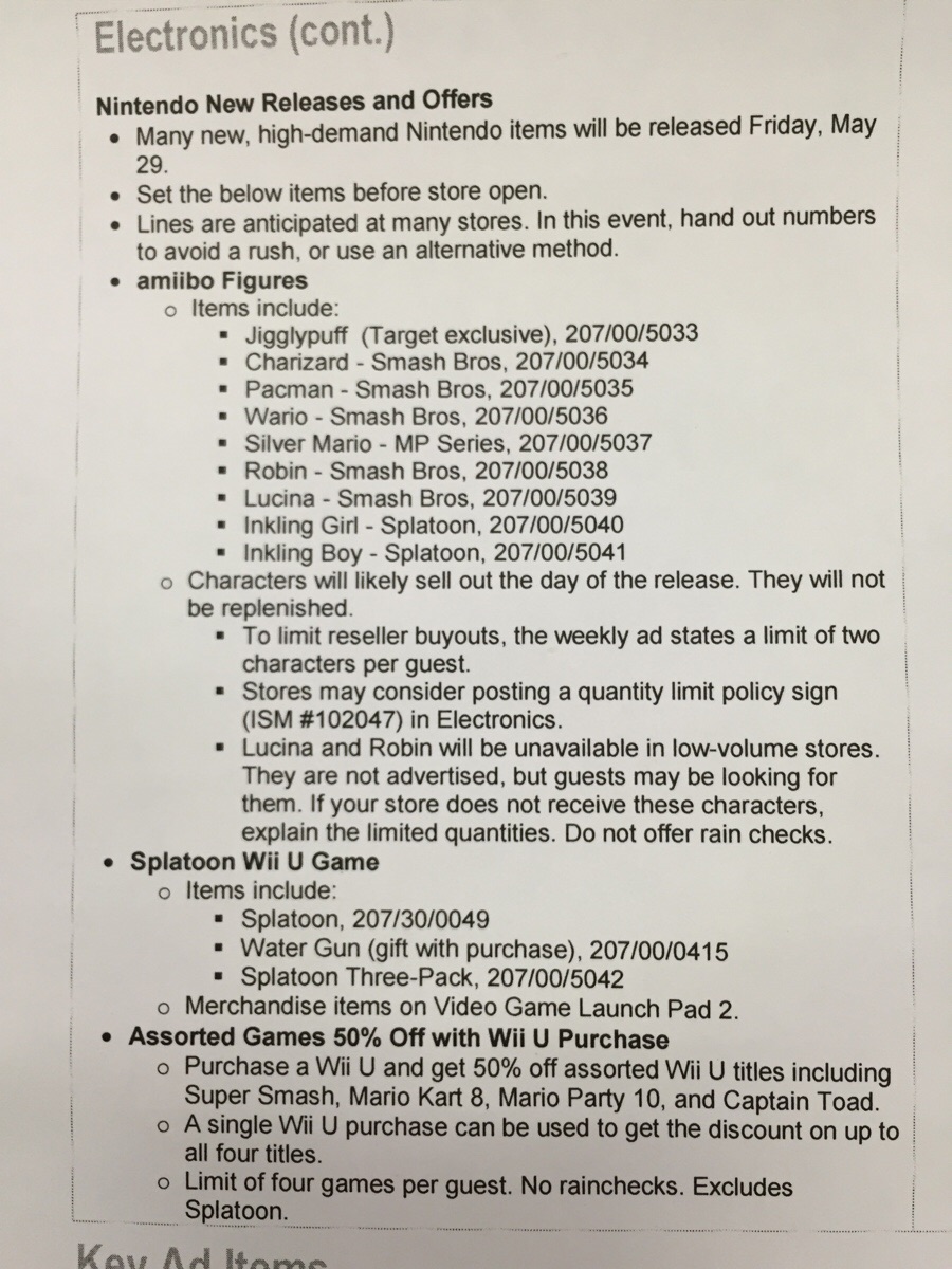 Target has started sending out an internal memo about next week’s Nintendo releases. A good portion of the letter is about the new amiibo, which launch on May 29.