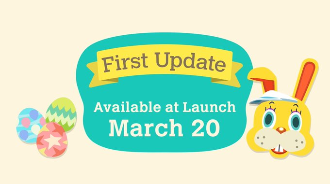 The first major update for Animal Crossing: New Horizons, Version 1.1.0, will be released shortly before launch. You can download the update if you have the game pre-purchased and pre-loaded on your Switch. This update is expected to introduce the Bunny Day holiday event and enables online play.