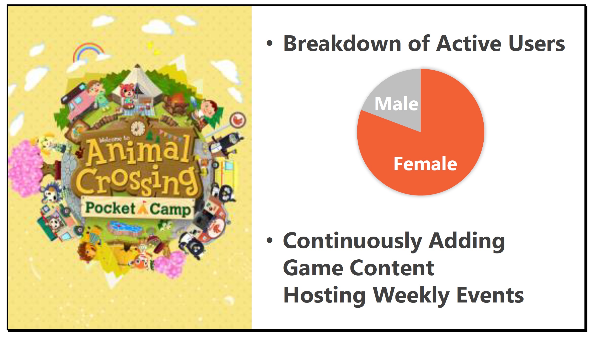 Animal Crossing: Pocket Camp was released in October of last year, and many people have played the game since then, especially adult women. Moving forward, we will make updates to add game content and continue to hold weekly events. Television commercials will air in Japan as well. We intend to continue to improve the service in ways that make the game more fun for consumers, all the while considering how this title contributes to revenue.
