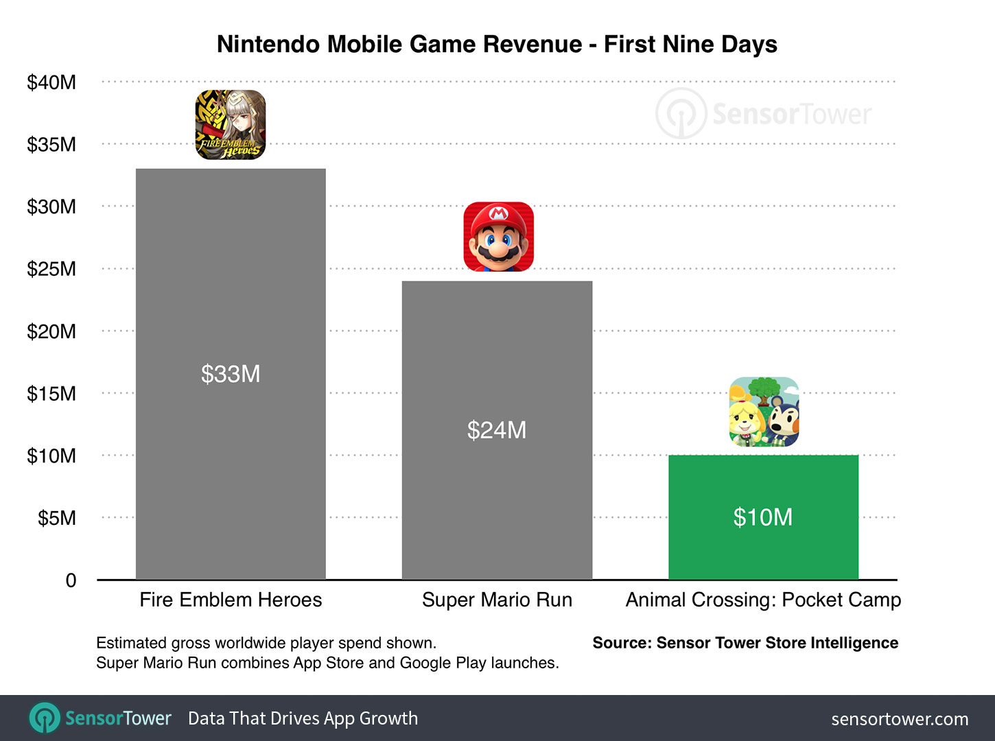 In its first nine days, Animal Crossing: Pocket Camp has generated roughly $10 million. That’s nothing to snuff at, but it’s behind Fire Emblem Heroes and Super Mario Run in terms of launch spending.