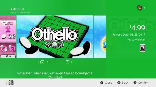 Othello is a Switch launch game on the eShop in Europe and Japan. The North American release should follow soon.