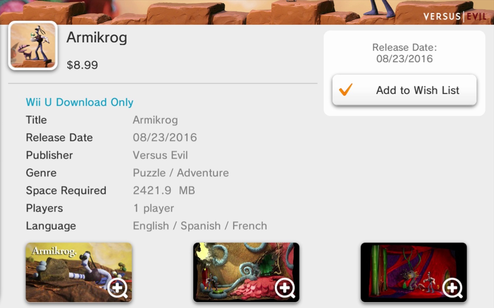 First, just like North America, Armikrog is due out for Wii U on August 23. Pricing is set at €9.99.