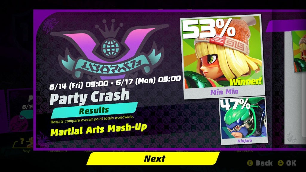 After several months of battles, the ARMS Party Crash Bash tournament has finally come to an end. This past weekend, Min Min and Ninjara battled it out under the theme “Martial Arts Mash-Up”. Min Min ultimately secured the final win with 53%.