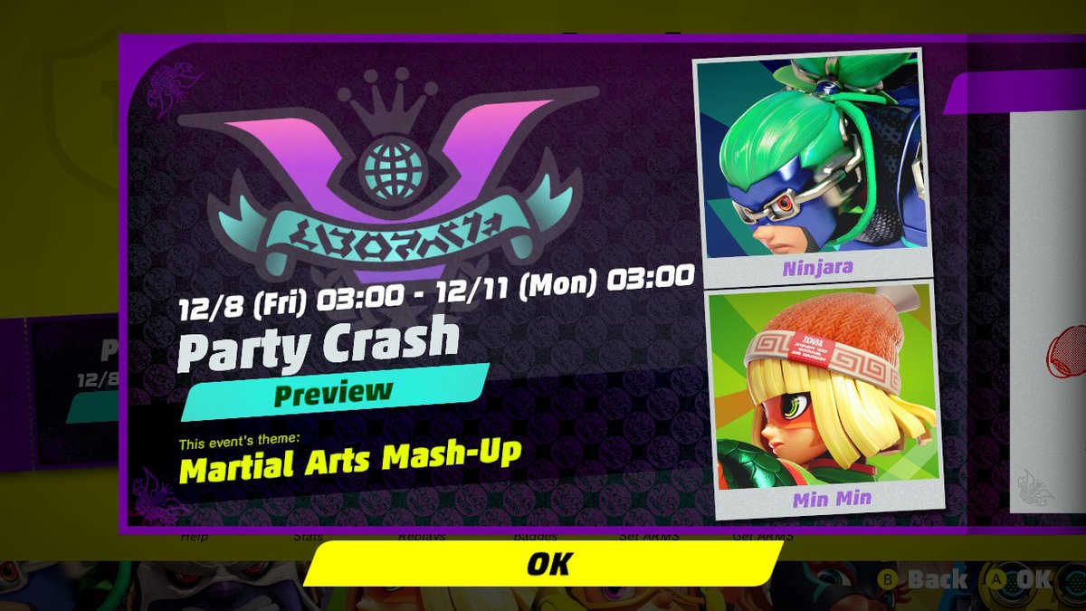 The second Party Crash event in ARMS will kick off on December 8, Nintendo has revealed. Ninjara will be going up against Min-Min. “Martial Arts Mash-Up” is the theme this time around.
