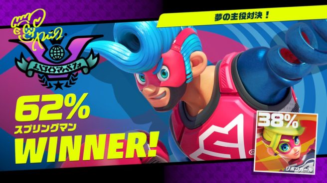 Nintendo has posted the results of the first ARMS Party Crash held this week. Spring Man won, having secured 62% of plays. Ribbon Girl had 38%.