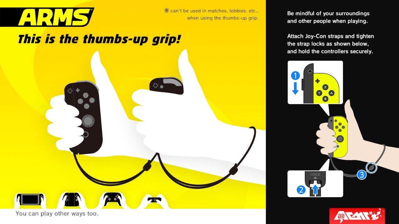 Nintendo is recommending that players use motion controls with ARMS, but the final game will include various options. One setup involves the thumbs-up grip.
